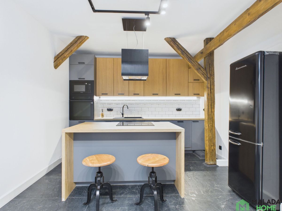Kuchnia została w pełni wyposażona w wysokiej klasy sprzęt Samsung oraz stylową lodówkę w klimacie retro/vintage,a elegancka zabudowa wykonana na zamówienie doskonale dopełnia wnętrze, łącząc funkcjonalność z ponadczasowym designem.