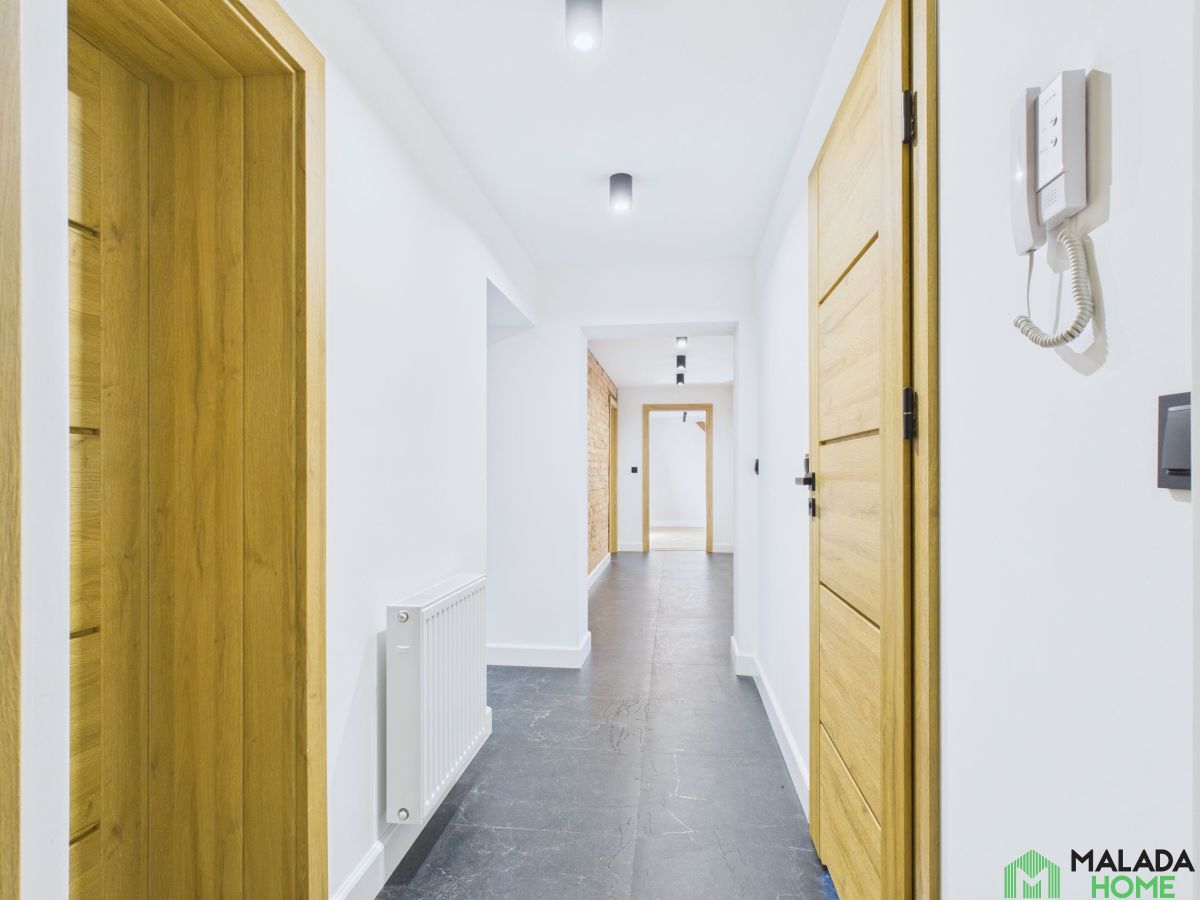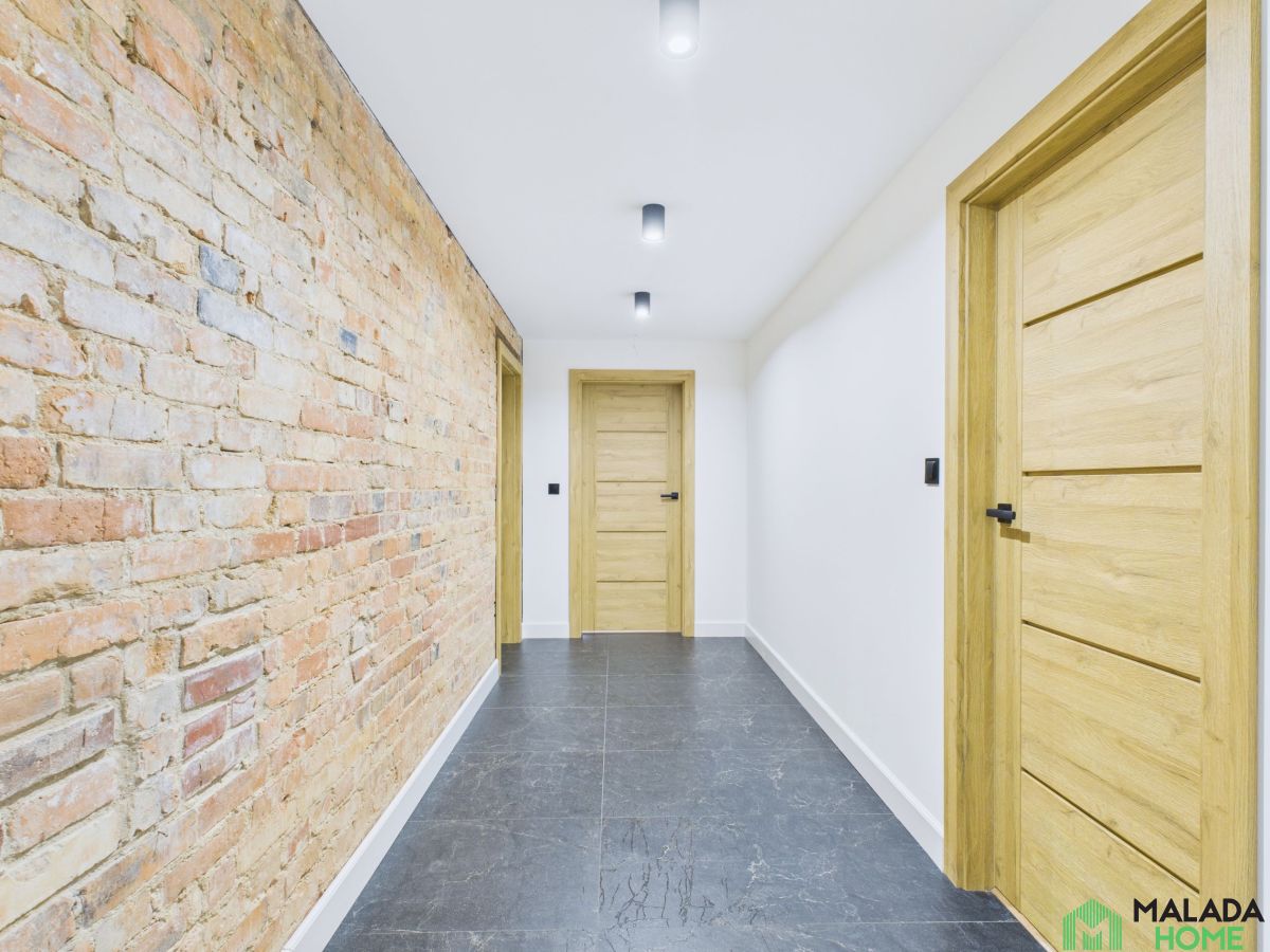 W korytarzu i salonie wyeksponowano piękną, oryginalną cegłę - starannie oczyszczoną i odrestaurowaną, która dodaje przestrzeni wyjątkowego charakteru i podkreśla klimat kamienicy.