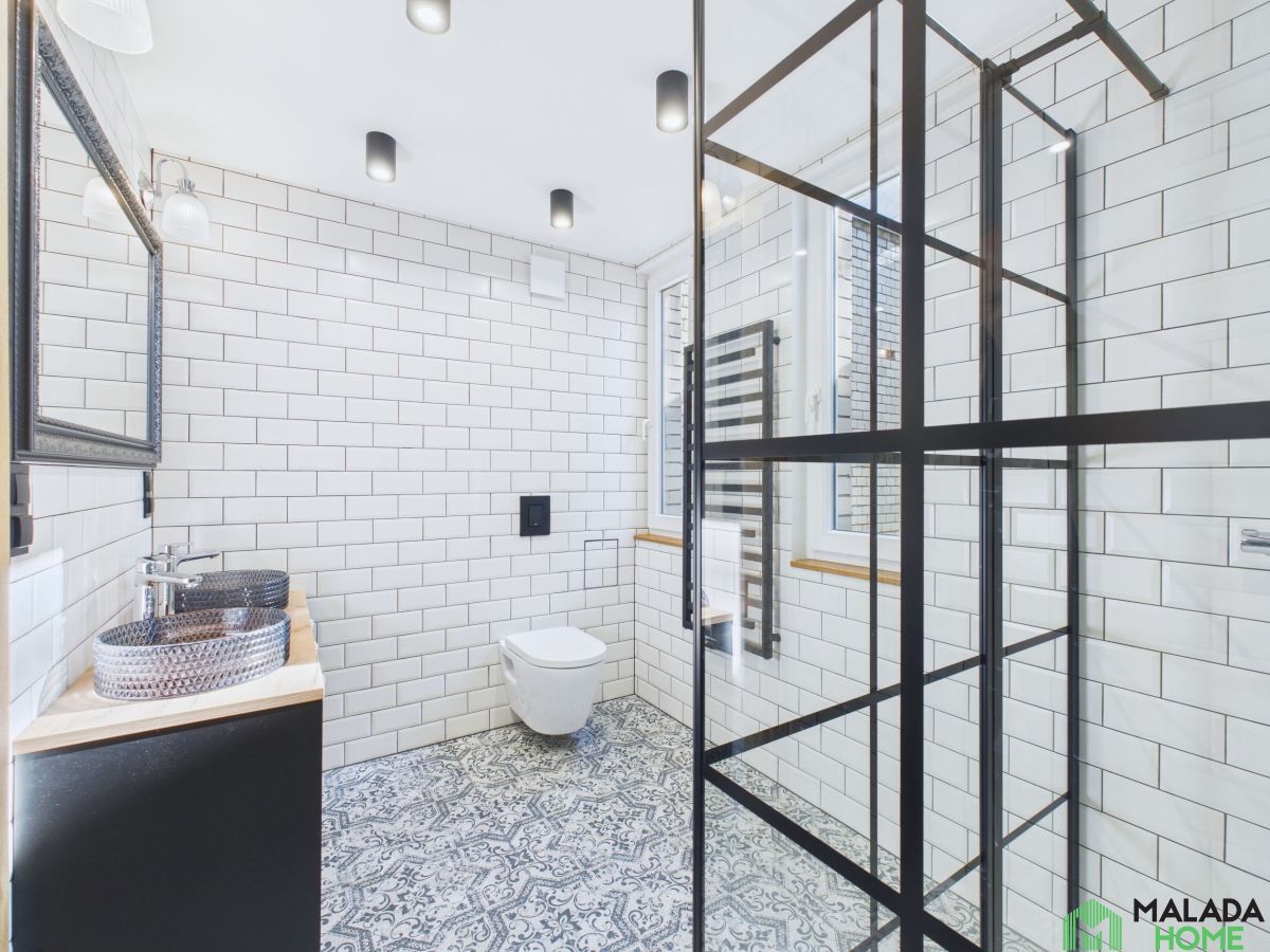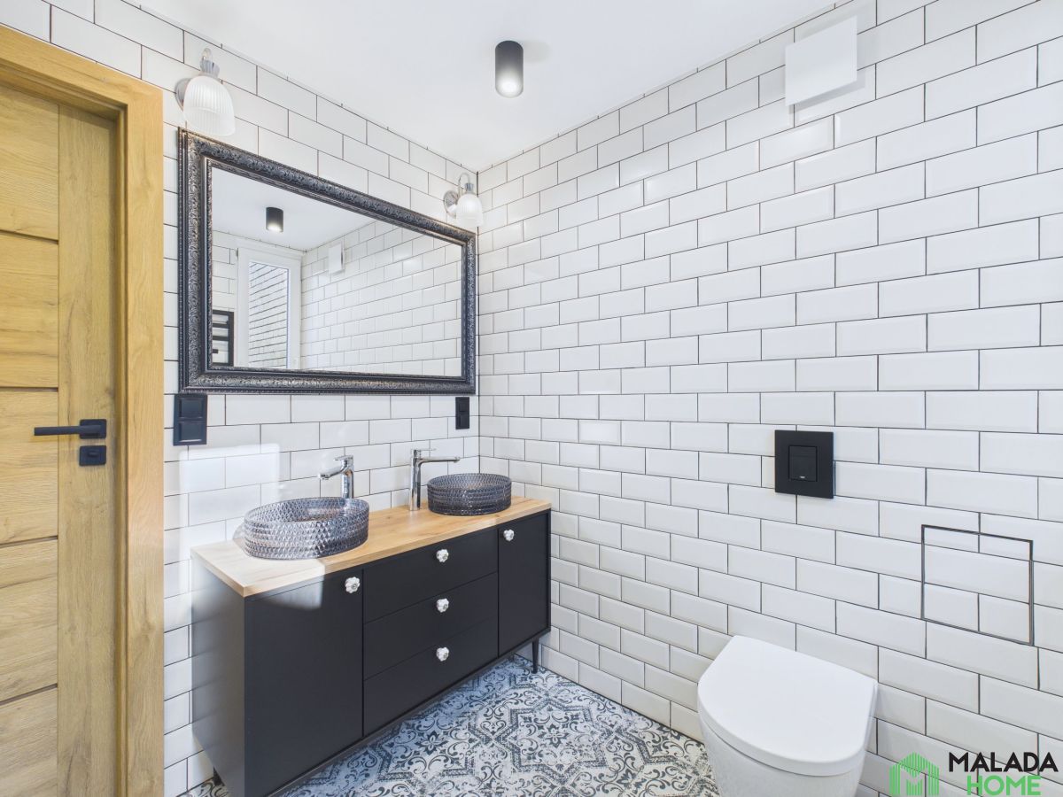 - Elegancka łazienka z oknem , dwiema umywalkami i przestronną kabiną prysznicową, zaprojektowana z myślą o wygodzie i komforcie na co dzień