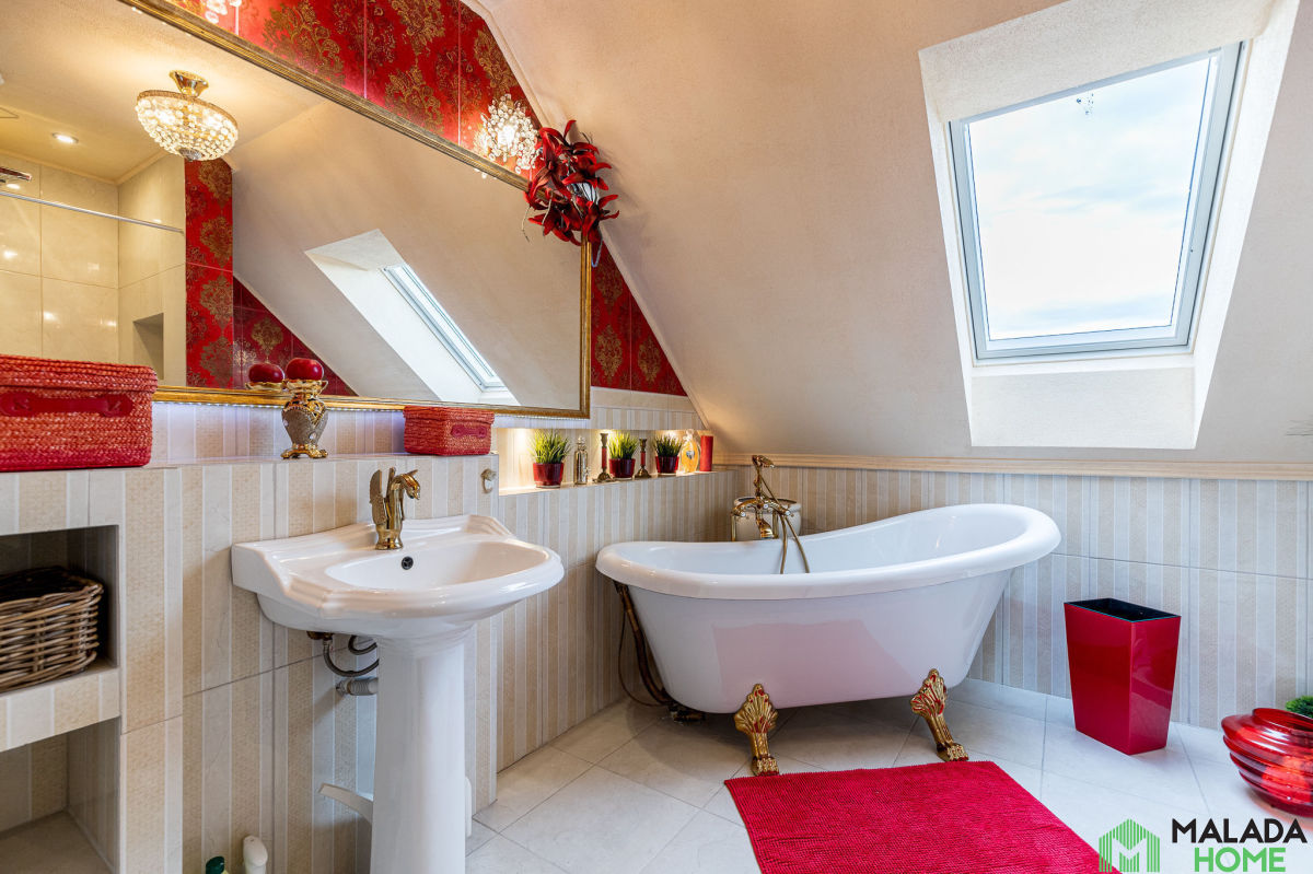 - łazienka z wanną i prysznicem, z oknem