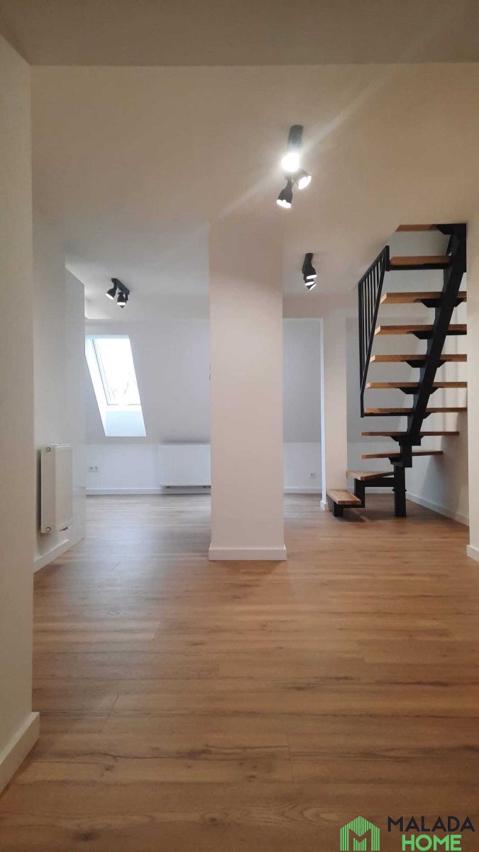 Apartament jest dwupoziomowy, na wyższą kondygnację prowadzą solidne i stylowe schody, co nadaje wnętrzu uroku. W kuchni i łazience użyto materiałów wysokiej jakości.
